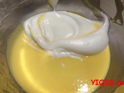 再取1/3蛋白霜加入搅匀,最后将剩下的蛋白霜全部加入,搅拌均匀至光滑细腻无颗粒。