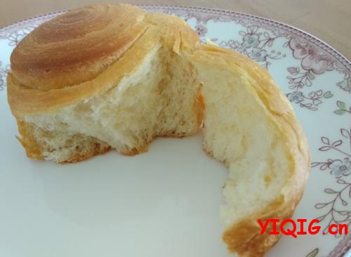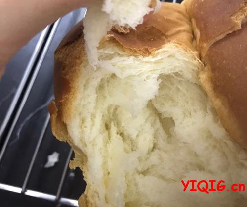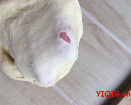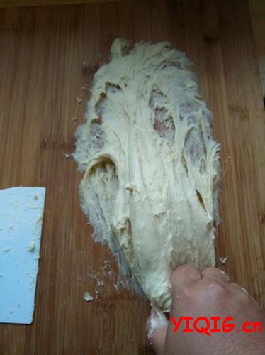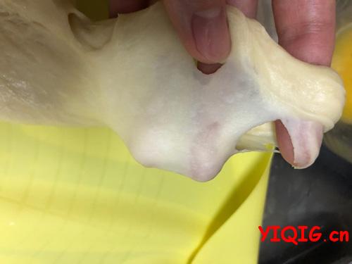 最后我想说不必太执著于出膜,如果不是做吐司,不用揉出所谓的“手套膜”。其实做过几次之后,我都不去拉膜检查的。拉膜的时候,手上抹点油,取下一小块面团,轻轻地拉开,能拉出比较厚的膜,有破口,边缘锯齿状,不光滑,一般面包只要揉到这个阶段,就是我发的那种比较粗糙膜也完全足够用了,做出来的面包能拉丝也柔软可口。www.yiqig.cn