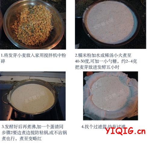 取其芽切碎待用。然后将糯米洗净后倒进锅焖熟并与切碎的麦芽搅拌均匀,让它发酵3~4小时。