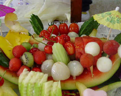 做法:苹果、鸭梨、菠萝洗净去皮,分别用圆珠勺挖成圆珠,荸荠洗净去皮,杨梅洗净待用。将白糖加入50毫升清水中,置于锅內烧热溶解。冷却后加入柠檬汁,把五种水果摆成喜欢的图案,食用时将糖汁倒入水果之上,即可。