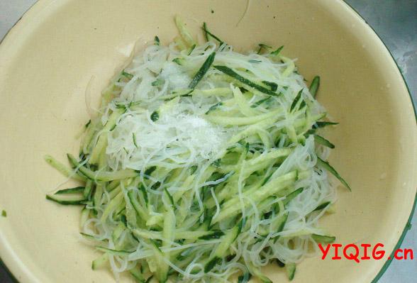 做法:把黄瓜洗干净去皮,切块,放入盘子里,把蒜剁碎,放入黄瓜里,再放入盐腌十五分钟,把粉丝洗干净,放入冷水锅里煮熟,捞出放入冷水里泡凉,捞出沥干水装盘备用,把黄瓜的水倒掉,放在粉丝上,然后倒入芝麻油、酱油、糖、醋和味精,吃的时候拌匀就可以了,这道银丝黄瓜可有效帮助降血压。