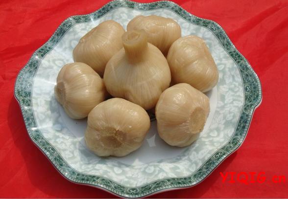 2、制法:(1)将大蒜头的根把削掉,剥去老皮(约2-3层)留下2-3层嫩皮,放入清水中浸泡,第二天换水,第三天捞出晾干。(2)把晾干过的蒜头入缸,把熬好的糖醋盐卤水倒入蒜缸内,撒上桂花。(3)每隔3-4天倒缸1次,倒缸3-4次后封缸两个月即为成品。
