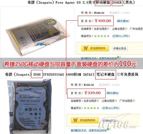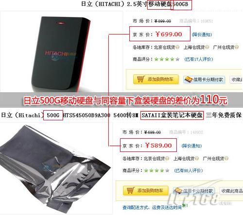 从京东上的报价看,日立500G容量的移动硬盘价格为699元,而2.5寸笔记本硬盘的价格则为589元,中间的差价为110元。