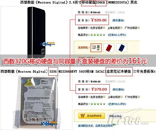 西数的硬盘相信众人皆知,是历史最悠久的硬盘厂商之一,从京东上的报价看,西数320G容量的移动硬盘价格为539元,而2.5寸笔记本硬盘的价格则为378元,中间的差价为161元。