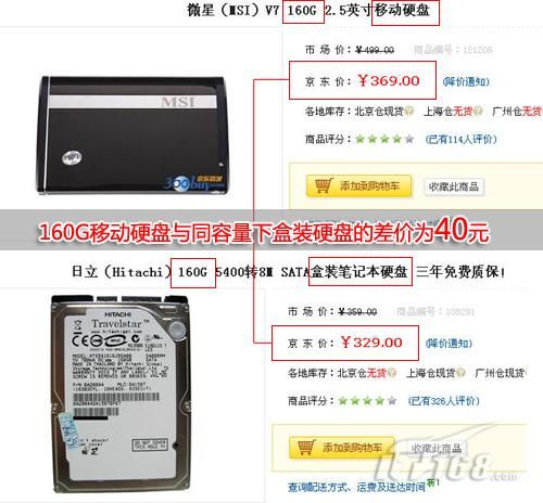 最后这款是微星的160G移动硬盘和日立的2.5寸同等容量笔记本硬盘的价格对比: