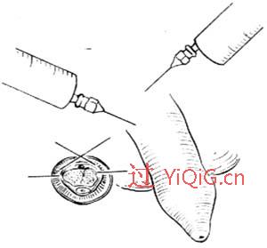 ⑴阴茎根部皮下及两侧阴茎海绵体麻醉