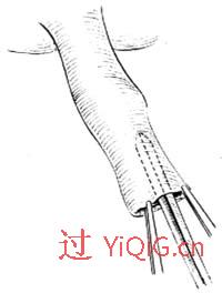 8.缝合 用细丝线先在环形切口的背、腹、左、右处各缝合一针,结扎不要太紧,以免组织水肿时勒坏皮肤。缝线不剪短,留作固定敷料用。再用每两针缝线之间缝合1~2针,缝针应靠近切缘穿出。