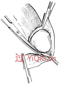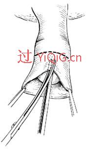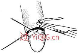 3.分离粘连 有包皮口狭窄及包皮与阴茎头粘连者,先用止血钳扩大包皮口,再用两把止血钳夹起背侧缘正中部位(两钳相距0.2cm)。用有槽探针分离粘连,直至阴茎头与包皮完全分开。再用消毒生理盐水清洁包皮囊及阴茎头。