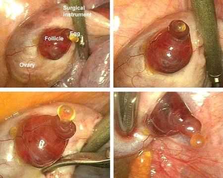 就在卵子释放前,酶分解了成熟卵泡中的组织,卵泡是包含卵子的卵巢表层一种充满液体的囊。这促使一种略带红色的突出的形成,过一会儿,一个小孔出现了,被支持细胞包围着,卵子从中释放。然后,卵子进入一根输卵管,由输卵管将其带到子宫。