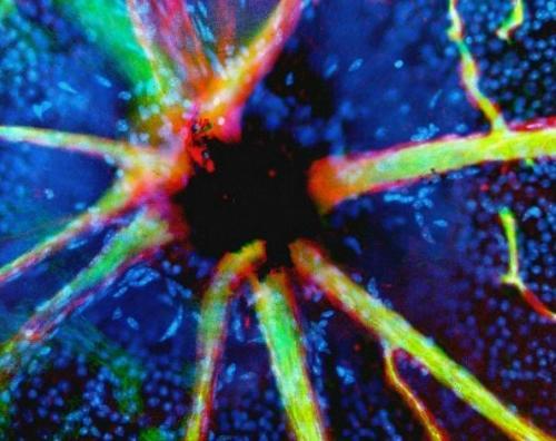 这张照片显示的是血管从黑色视盘中伸出。视盘是个盲点,因为视网膜的这个区域没有光感细胞,视神经和视网膜血管从眼睛后面的这个部位伸出去。