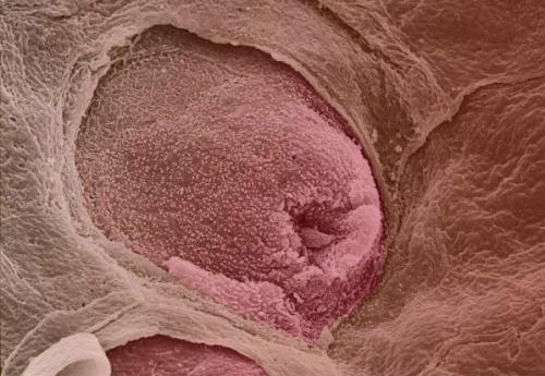 这张彩色图片上显示的是舌头上的一个味蕾。人舌上大约拥有10000个味蕾,味蕾所感受的味觉可分为