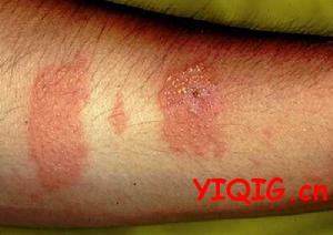 4、躯干:初为小的红褐色毛囊丘疹伴油腻性鳞屑,后渐成中央为细糠状鳞屑,边缘有暗红色丘疹及大油腻性鳞屑的环状斑片,多发于前胸及肩胛骨间。