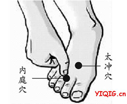 太冲穴在足部大脚趾和第二脚趾之间的缝隙向上约1.5厘米的凹陷处,属于足厥阴肝经,对灭肝火效果良好,如头痛眩晕、面红耳赤、口苦咽干等。经常按摩有舒肝理气、通调三焦气机等功效。可用大拇指的指腹按揉一侧太冲穴,3分钟左右后换另一侧,两侧交替按摩10~15分钟左右一起过www.yiqig.cn 。每天操作前可以泡泡脚,使身体更放松,按揉时要用一点力度,以产生轻微的酸胀或胀痛感为宜。