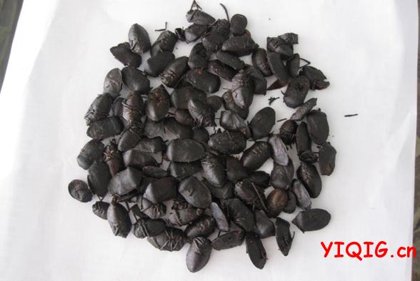本品略呈六角状扁椭圆形,长1.6-2cm,宽约1cm。表面棕褐色或棕黑色,略有光泽。头部小,与胸部略呈三角形,复眼突出,卵圆状,单眼1对,触角1对各5节,多已脱落。腹部棕红色至棕黑色,每节近边缘外有突起的小点。质脆,折断后腹面有浅棕色的内含物。气特异味微咸。以个均匀、棕褐色、油性大、无虫蛀者为佳。