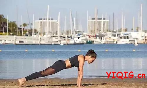 从下犬式,往前来到斜板式。肩膀对齐手腕、脚跟对齐脚趾。