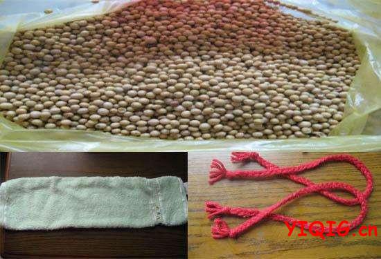 3.把一端用绳子扎紧,然后把放凉以后的黄豆放进去,留一些空间,让黄豆更加紧实。