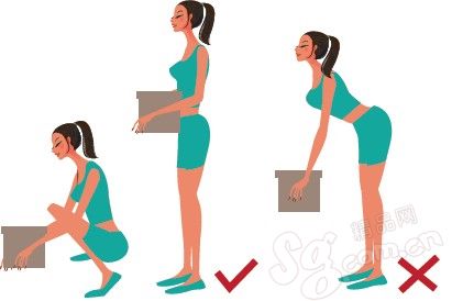 正确姿势:先将身体向重物尽量靠拢,然后曲膝、曲髋,再用双手持物,伸膝伸髋,重物即可被搬起。这样,主要依靠臀大肌及股四头肌的收缩力量,避免腰背肌用力,腰部损伤的机会也减少了。另外,在搬移重物时,要注意使双膝处于半屈曲状态,使物体尽量接近身体,则可减少腰背肌的负担,减少了损伤的机会。
