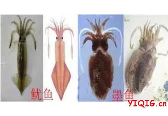 同样重的墨鱼、鱿鱼,墨鱼体长比较;鱿鱼要比墨鱼长四分之一到五分之一。但剖开后墨鱼两边的肉比鱿的宽。