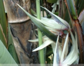 大鹤望兰 又称尼古拉鹤望兰、大天堂鸟、白鸟蕉、白花天堂鸟、野芭蕉等。旅人蕉科鹤望兰属。多年生草本植物。植株高可达8米,茎木质,丛生。叶大型,2列着生于枝端,具2米左右和长柄,叶柄长1.5米,叶片长圆形,革质,亮绿色,长约1~1.5米,基部心脏形,状如芭蕉。整