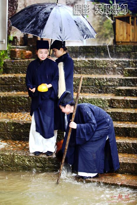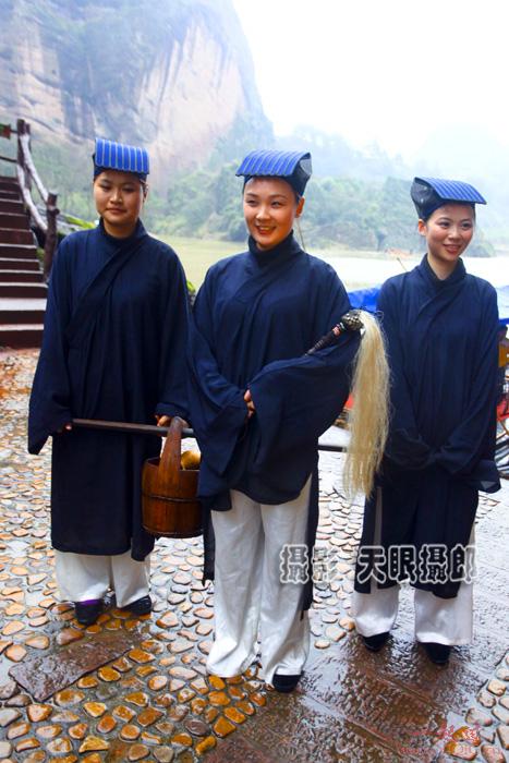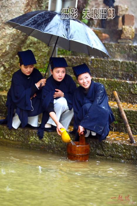 这一日我们搏动江西考察团的博主们乘船冒雨游览龙虎山,在泸溪河的仙女岩码头,居然邂逅了龙虎山最美道姑妙妙。只见三个身穿藏蓝色道袍的女道姑正在河边打着伞舀水,中间那位长相清纯秀丽,仪态端庄典雅的美女道姑不用指点,一看就是爆红网络的妙妙,只见她们手提一只小木桶,拿个葫芦瓢子在河边盛水。春雨之中,美丽的龙虎山下泸溪河畔,美女道姑提水的画面看着令人神清气爽,好一副山居仙女图。