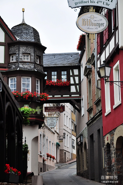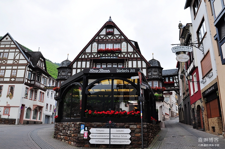 沿着石板小路一直往山上走,恍若童话中的小屋一路陪伴,尖尖的屋顶,五彩缤纷的墙壁,窗户上悬挂着白色手工勾绘的窗帘,清新淡雅,墙壁上彩色的壁画充满童趣。来到小镇最高处,脚下大片大片绿色的葡萄园,这里是德国富有盛名的葡萄酒产地,而不远处就是急促流淌的莱茵河,森林掩映中的古堡与小镇遥遥相对。