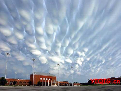 乳房云。当寒冷、充满水汽的空气从暴风云上部快速下沉时,就会形成乳房云。湿冷空气快速下降就会形成类似奶牛乳房的向下的凸起。当崎岖不平模样的乳房云形成时,通常会发生暴风雨,并伴随着雷暴现象。此名字来自拉丁语“乳房”。图片显示的是2004年6月美国内布拉斯加州一座体育场上空的壮美景象。