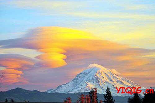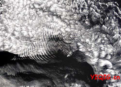 波浪云。这是南印度洋上一个火山小岛—阿姆斯特丹岛上空的波浪云。湿润的云层在小岛上空经过时,湿润空气上升和下降形成了这种狭长的透镜状云彩。