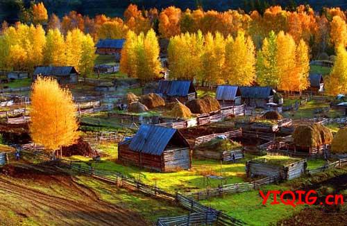 西北第一村布尔津白哈巴村。每年的9月15——10月中旬,新疆布尔津白哈巴村的景色特美,一片金黄色,美的令人窒息!最好和驴友团队一起去,会玩得更尽兴!如果要去看秋色,自己提前关注树叶的变化情况,和驾驶员聊天,他说一般树叶一周就没了。一场秋风或者雨雪树叶就没了。