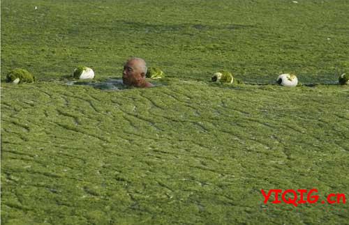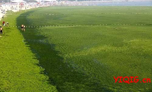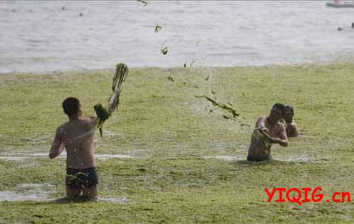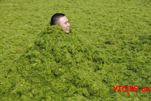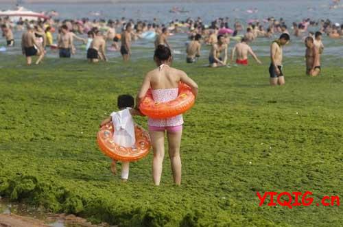 别有韵味的青岛海滩,你不一定有幸见到。2013年7月3日,山东省青岛市,受持续南风影响,浒苔绿藻登陆青岛海滩,山东省青岛市大量绿色浒苔堆积在海滩,使得青岛海滩变“草原”。你能辨我是草原还是海滩?不过,即使这样,海边仍然有很多游客,并且很多人玩得不亦乐乎!