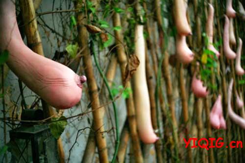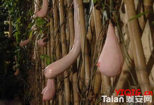 所有“丝瓜”都是长条形。它们略带桃色,就像人类的皮肤,而不是这一物种常见的绿色。这种果实和藤蔓在竹架向上爬着墙“生长”。
