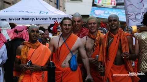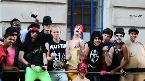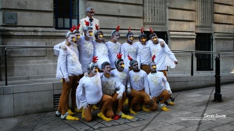 那天,路过LSE的时候发现很多学生穿着奇装异服,于是拿起相机照相,很有意思,一群男生穿成“鸡”,后面另一个男生化装成“肯德基爷爷”。