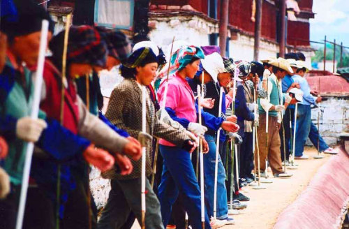 走在一处僻静的民居小巷里,听到了一阵隐隐的歌声。那歌声像蓝天上的云缕,若断若续;又像荒山坡的草色,若有若无。循声寻去,看到几个当地的藏族同胞在垒土墙。两个裹着头巾的女人在地面和泥,三个健壮的汉子在房上作业。女人的歌声清越,汉子的和声浑厚。我远远地站在小巷里倾听,感觉听到了高原天籁。