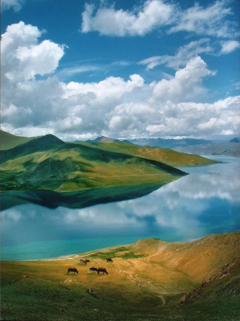 羊卓雍湖那一汪惊心动魄的碧蓝,足以让人痴迷和晕眩。那是湛蓝的天空挤出的汁液酿造而成,还是天工神力开掘出的巨大碧玉? 是梦幻中的仙境,还是灵魂出窍的幻象? 羊卓雍湖展示着超凡脱俗的美丽,高贵的美总是有着惊心动魄的高度!