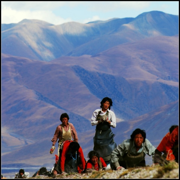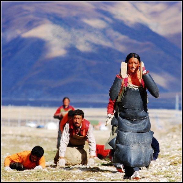 路途中常常可以看到一路磕头的信徒,他们与土一色,神情坚定,手持快要磨透的木板,胸前挂着耐磨的橡胶与皮革,一路磕来,风尘仆仆,让人感动,让人折服,更让人叹为观止。