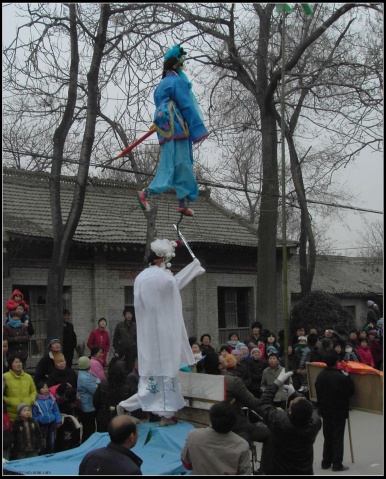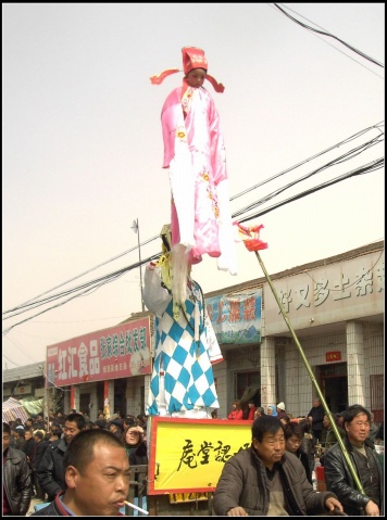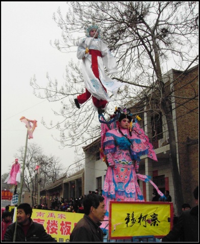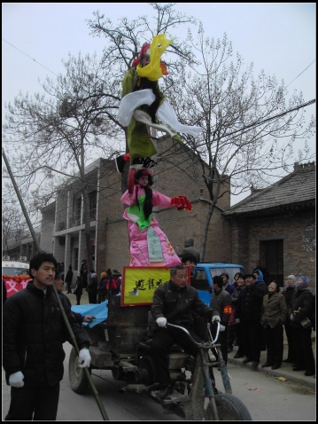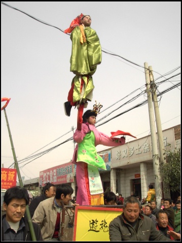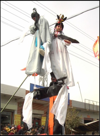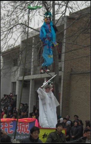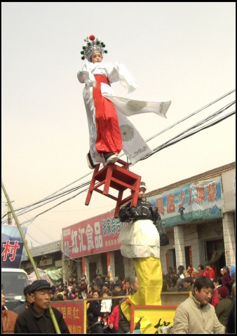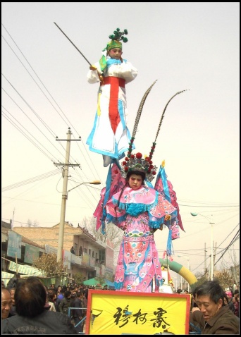 所谓险者,比如《断桥》许仙赠伞一台中,桌子上站的许仙手打一把雨伞。伞上左右趴着青白两条蛇,蛇头上分别站着白蛇和青蛇两个人。所谓巧者。比如在《龙江颂》江水英劝阻大队长一台中,江水英正在飞针走线纳鞋底,高高举起的鞋底顶短站着粗大威猛的大队长。所谓干净者就是说芯子装扮好以后,不是内行人根本弄不明白其中的玄妙之处,还以为是真的呢。我小时候看芯子就常常担心站在上面的小孩子会掉下来。所谓文雅者就是说每一台芯子都是一个文化单元。或者一出戏,或者一个历史古典。前面的一块小牌子上是标题,上面书写一个成语或者一个故典暗射这台芯子所扮的内容,供那些有文化的人去猜。这种形式又叫做“射虎”。因之有的人也就把社火也叫做“射虎”。