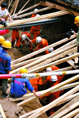 昨日,消防官兵在塌方现场全力施救。昨日上午9时20分,西安地铁一号线洒金桥站施工工地发生塌方,两名正在作业的工人被埋。三个小时后,两人被陆续救出时,已无生命体征,送往医院后经抢救无效身亡。据施工方工作人员介绍,可能因为近日连续下雨,土质松软才导致塌方。张望 摄