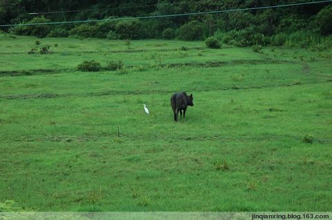 (牛与鹤共享一片绿洲,显得十分安详和宁静。本想走近一点拍摄,但惟恐我这位不速之客的“第三者”破坏了这份美感!)