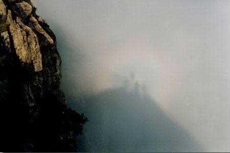 每当云雾弥漫的清晨或傍晚,游人站在较高的山头上顺光而视,就可能看到缥缈的雾幕上,呈现出一个内蓝外红的彩色光环,将整个人影或头影映在里面,恰似佛象头上方五彩斑斓的光环,故得名“佛光”或“宝光”。