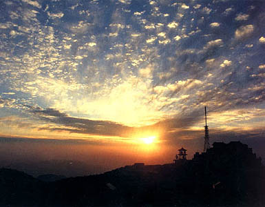 云海玉盘是泰山岱顶的一大奇观。夏天,雨后初晴,大量水蒸气蒸发上升,加之夏季从海上吹来的暖温空气被高压气流控制在海拔 1500米左右的高度时,如果无风,在岱顶就会看见白云平铺万里,犹如一个巨大的玉盘悬浮在天地之间。远处的群山全被云雾吞没,只有几座山头露出云端;近处游人踏云驾雾,仿佛来到了天外。