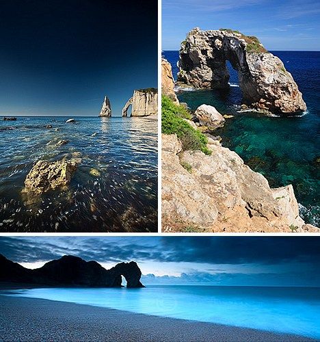 我们的第一站是法国。法国诺曼底的埃特尔塔(Etretat)因其壮丽、独特的悬崖而闻名世界,其中就包括自然形成的海蚀拱。海蚀拱的左侧,海水正在侵蚀另一个现在还只是海蚀柱的海蚀拱。接下来,我们来到西班牙,欣赏一块岩石上形成的可爱大洞。最上方右图的海蚀拱位于西班牙巴利阿里群岛马洛卡岛的卡拉桑塔尼。你是否准备乘船进行海上之旅?从那里来到英国的多塞特郡,可以在黄昏时分赶到著名的“多尔塞门”(Dorsel Door)附近,切身体验海滩美景。