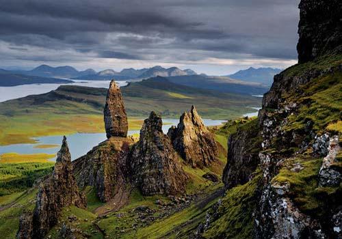 斯凯岛的托洛特尼半岛和罗萨海峡处,玄武岩尖峰隐约可见。由古老山体滑坡形成的玄武岩,见证了引发地貌改变的地质剧变。宁静的水域和轻灵的晨雾仿佛掩盖了大自然摧枯拉朽的神奇力量,红色库林山脉(Red Cuillin)正是它用花岗丘陵一点点雕刻而成的。由大火山形成的斯凯岛,历经数百万年风雨侵蚀和冰川冲刷。