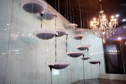 在世界巧克力梦公园现场,记者抢鲜看到”中国最大巧克力瀑布”现身─在恒温微控的玻璃屋里,每天流动着1.5吨的香味浓郁、香滑柔顺的巧克力浓浆,加上水晶琉璃吊灯的投射光影,流动着现代中国的精致与浪漫唯美,世界巧克力梦公园总规划师林正宗老师指出:”这座巧克力瀑布体现了巧克力的时尚艺术,让我们可以从观赏的角度,看见巧克力除了饮食功能,更可以是一种公共艺术的全新表现模式。加上巧克力有着使人产生愉快情绪的成分,站在巧克力瀑布前方赏心悦目又浪漫,闻着巧克力香心情特好,预计