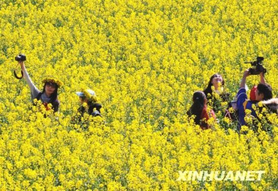 2月3日,游人在罗平县生态油菜种植园一片油菜花盛开的田园里赏花、玩耍。新华社记者 陈海宁 摄