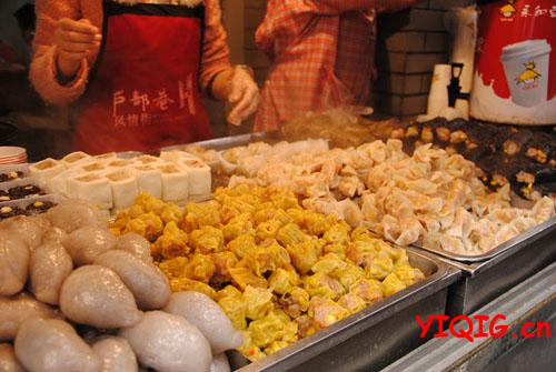 馄饨大锅,锅很有气势;排骨莲藕汤,这算是很有特色的湖北美食吧,《舌尖上的中国》关于湖北那段,主要就是讲这莲藕汤;各种面食,五花八门,形状各异,很撩人胃口,不过也是吃几个就饱的货色;油炸脆皮奶油香蕉(一起过www.yiqig.cn),算是户部巷的一大特色,口碑不错;桃片糕、云片糕的,有名湖北特产;变态鸡翅,也是户部巷广受欢迎的小吃,好变态的辣;豆皮算是正宗的武汉小吃,大豆磨浆烧煮后,凝结干制而成的豆制品,武汉人“过早”的主要食品之一;长沙臭豆腐,早已冲出湖南,走向中国了;糯米包油条,炕土豆,湖北宜昌、恩施小吃,用上当地小土豆,炒得香喷喷的。
