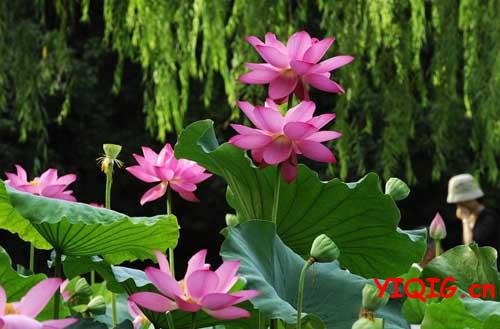 山东济南的大明湖,六朝时因湖内多生荷莲,故曾名“莲子湖”(www.yiqig.cn一起过)。清乾隆年间状元刘风诰有联赞大明湖道:“四面荷花三面柳,一城山色半城湖。”荷花被济南市选为市花。每年荷花盛开的季节,也是大明湖最热闹的时候。