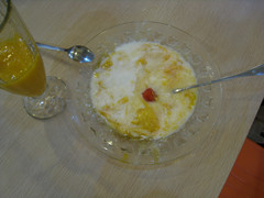 这真是该分享的一大盘刨冰,馥郁的芒果堆在小山似的碎冰上,再淋上滑滑的奶油,甜甜的果酱……我们的手几乎同时拿起了勺子,冲着这一盘芒果冰下了手。那清凉的甜直抵肠胃,旋即冲击大脑皮层。轶补充的那句“大家一起吃!”已经是非常多余。