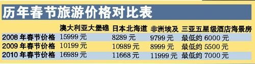 记者昨天翻阅各大旅行社的报价发现,澳洲游去年豪华团的价格也就11888元,而今年澳洲8天游的最低价格是16989元,如果是澳洲与新西兰联游,最低价格则高至21989元;再如日本,去年春节东京、大阪的常规线价格是5889元,今年春节最低已经是7000元左右了;再如北海道,去年12月份的价格只有六七千元,而今年春节动辄都要12000元左右了。